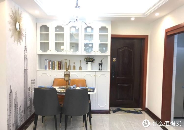 这套房子没有设计玄关,不过进门的右手边起了一套很漂亮实用的玄关柜。玄关柜的边上就是开放式小餐厅,因此玄关柜的下半部分是收纳鞋柜,中间的凹槽可以收纳随手物品,上面的展示收纳柜就当做餐边柜来使用了。