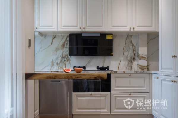 佰富彩上图是厨房装修效果图。厨房是开放式的,由一个实木吧台将餐厨区分开。米白色的橱柜配上带有石纹的岩板显得既和谐又富有层次感。冰箱、烤箱等电器都做了嵌入式设计,使得整个厨房空间看起来十分地清爽整洁。