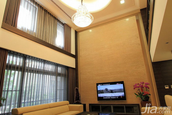 从电视墙的设计就给人一种气派辉煌的感觉。对称设计的窗帘框,则在这个客厅中呈现出一种古典的气息。这样的设计搭配让整个客厅在简约的设计中呈现出一种大气古典味道来。