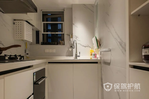 厨房以L字形的操作台空间,灰色地面+白色的墙面与橱柜,使得整个厨房空间都显得实用而又现代大方。操作台后方还加入了一个收纳柜,电饭煲与一些厨房用品都可以收纳在此,保持着厨房操作台区域的简洁效果。