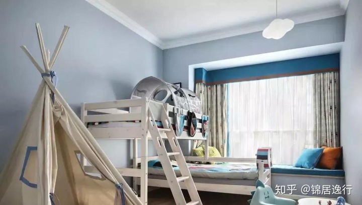 佰富彩这款儿童房的布置带着一种凌乱美,很能提升孩子探索的兴趣。搭建了一个小帐篷,可供孩子玩耍。