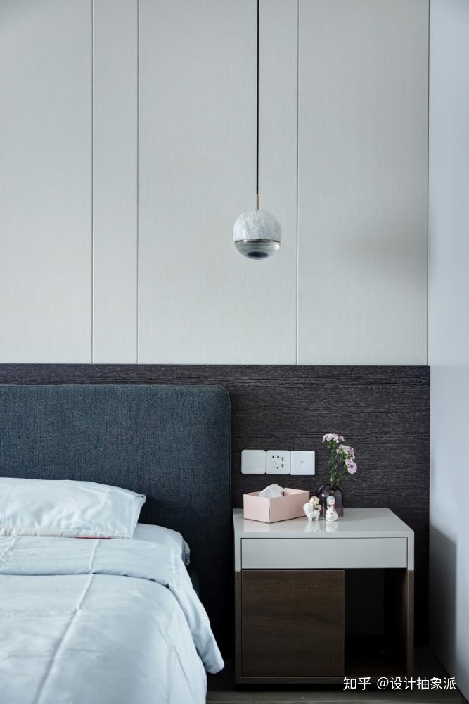设计巧妙的垂线吊灯悬挂在床边,简约的床头柜上摆放着花瓶和装饰品。