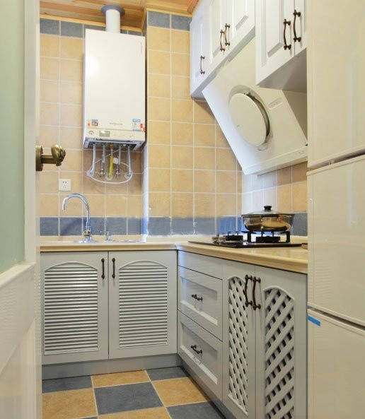 在装修和布置小户型厨房的时候不仅需要色彩,还需要亮度,因为小厨房的使用面积非常有限,所以在整体色彩安排方面,应切忌花花绿绿。特别要注意不能使用印有立体感图案或明暗对比强烈的装饰材料,否则不仅会使厨房面积在视觉上显得狭小,而且容易使人产生凹凸不平的错觉。尤其是墙面色彩安排宜以白色或浅色为主,不宜使用反差过大的颜色。