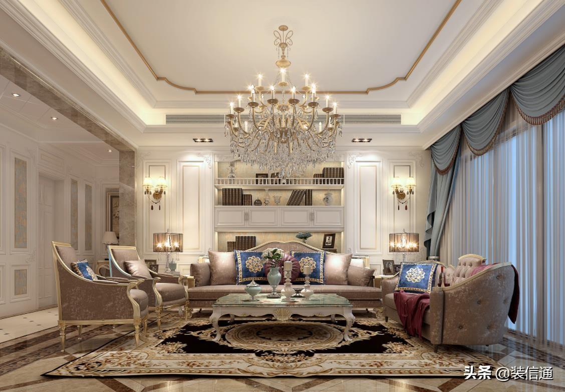 2、欧式客厅顶部喜用大型灯池,并用华丽的枝形吊灯营造气氛。门窗上半部多做成圆弧形,并用带有花纹的石膏线勾边。