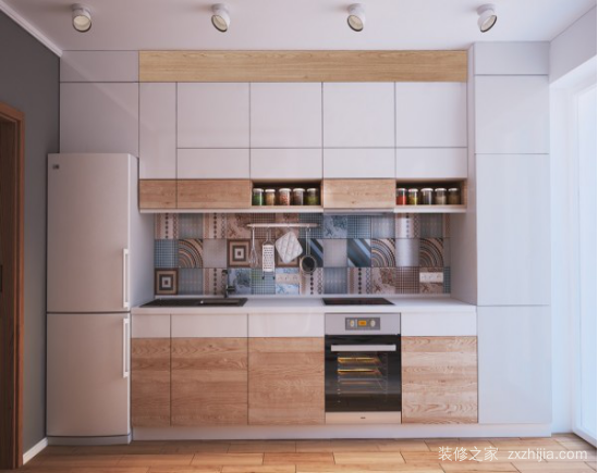 因为面积有限,所以开放式的厨房在小户型中很普遍。原木拼接的橱柜透着原宿风四十平小户装修,留出了冰箱的空间,整合厨房的设计,将设计感发挥到极致。