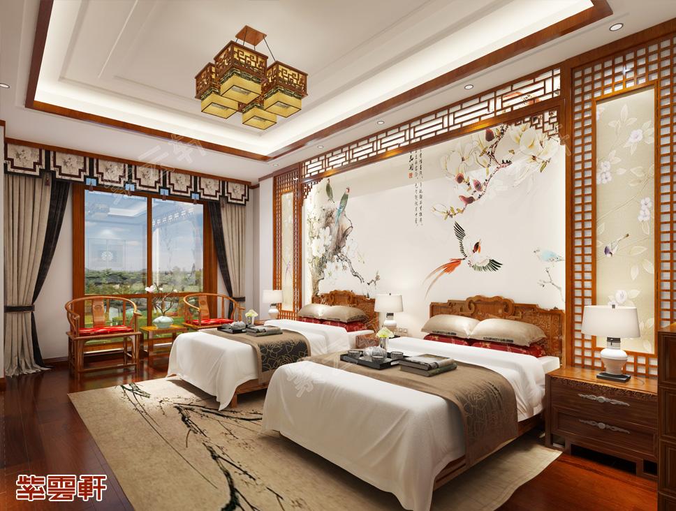 主卧,古色古韵的房间中摆放着了两张黄花梨精雕床,极具复古简约中式设计,床头的花鸟图灵动出纳神简中式装修效果图佰富彩,房间布置像极了旧时王公贵族所居住的环境氛围,仙气古风房间装修,完全可以用此作为参照物,仿佛看到了自己的新家。