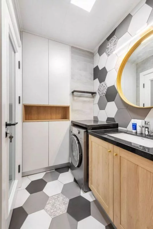佰富彩卫生间以不同颜色纹理的六边砖拼接地面墙面,搭配木质洗手盆柜与侧边白色的收纳柜,洗衣机嵌入到洗手盆旁边的台面下,小小的空间也充满文艺自然的氛围感