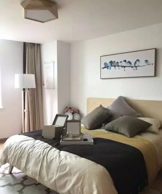 卧室的床也非常完美的诠释了MUJI风的精髓,床的布局设计较低,也无形之中增加了房间的空间感,原木色的衣柜和地板床头柜等自然相呼应,没有夸张的重色调,用壁画的色彩作为调和环保装修,沉静之中又带有灵动的元素!