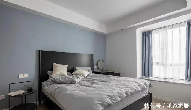 在卧室的设计上,总会将舒适作为一个重要指标,而色彩、灯光、材质等都其中代表元素。同时兼顾灰色深沉高贵又不冷淡厚重、蓝色优雅气质又不忧郁轻佻的灰蓝色背景墙。