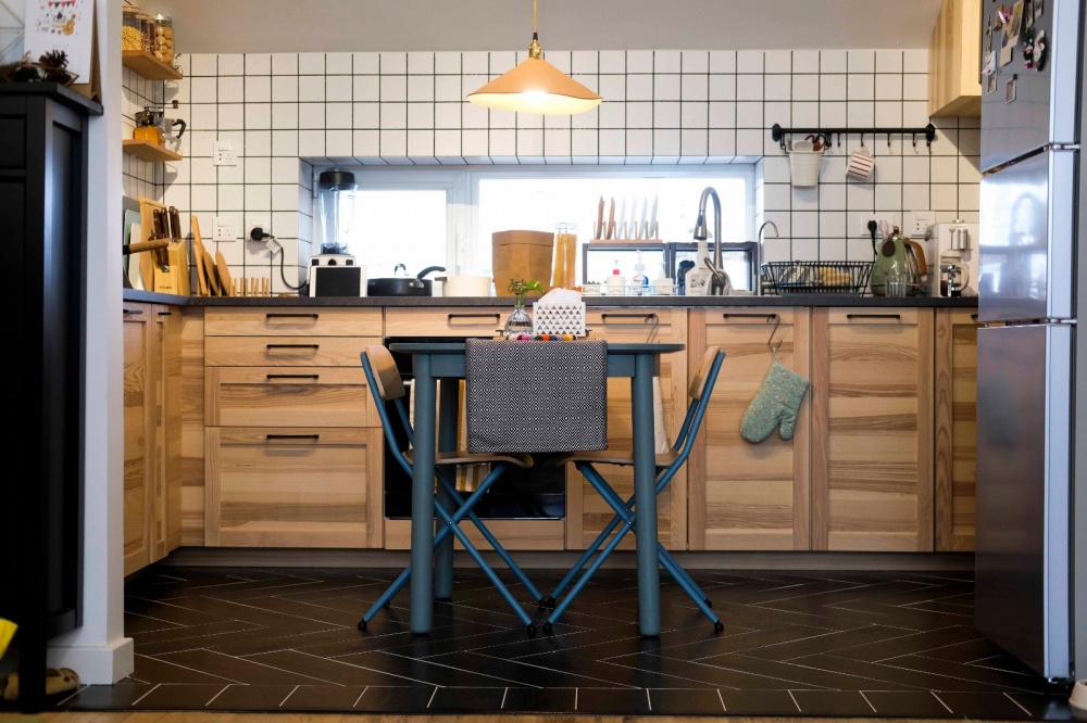 餐厅橱柜装修效果图原木与灰绿撞色装修厨房效果图,一张方桌让厨房潮流混搭厨房设计图片赏析