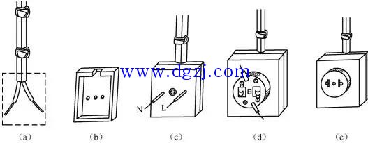 佰富彩⑤ 在导线进入插座前,要在距插座较近处安装一个瓷板夹,如图8-19(e)所示。