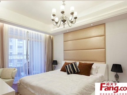 简约欧式风格主卧室:卧室在设计上把握了欧式风格元素,融合了现代简约的设计理念,让卧室更加符合现在人的生活理念三房二厅装修效果图,卧室的颜色搭配的也相当的不错,床头背景墙让真个卧室显得特别的高档。