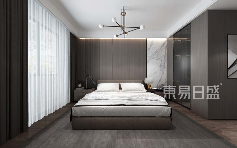 在原本主卧的空间里,增加了衣帽间餐厅吊顶装修效果图,增加了储物空间。穿过衣帽间再到卫生间,整体动线流畅,主卧空间局部做吊顶,不影响房高的情况下,增加辅助光源,平板线的整体性。床头背景运用石材和墙板的材质。整体美观。