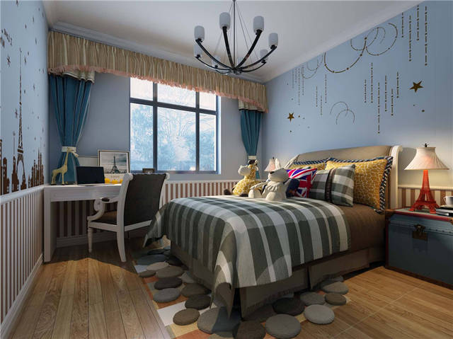 这款儿童室内装修效果图中,整个墙面以蓝色来装饰,浪漫温馨的蓝色让整个空间变得清新自然儿童房装修效果图男孩佰富彩,同时给了孩子一个充满想象的空间。美观实用的双人床设计,让两个孩子有了自己的独立空间。