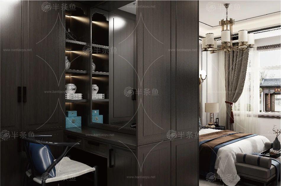 如果从窗口的角度看过去,说是现代风也并不违和。不得不说这套房的举架确实高,做了吊顶又选择了这样一盏吊灯,在深色调的衣柜衬托下房间并不压抑。如果净举架低于两米九的房间绝对不建议选择这样一盏灯。