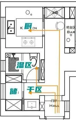 佰富彩设计师对卫生间、厨房以及储物间的格局进行大调整。将厨房拆分为干区和储物间,原来的储物间调整为厨房(不移动煤气表,仅重接管道)。