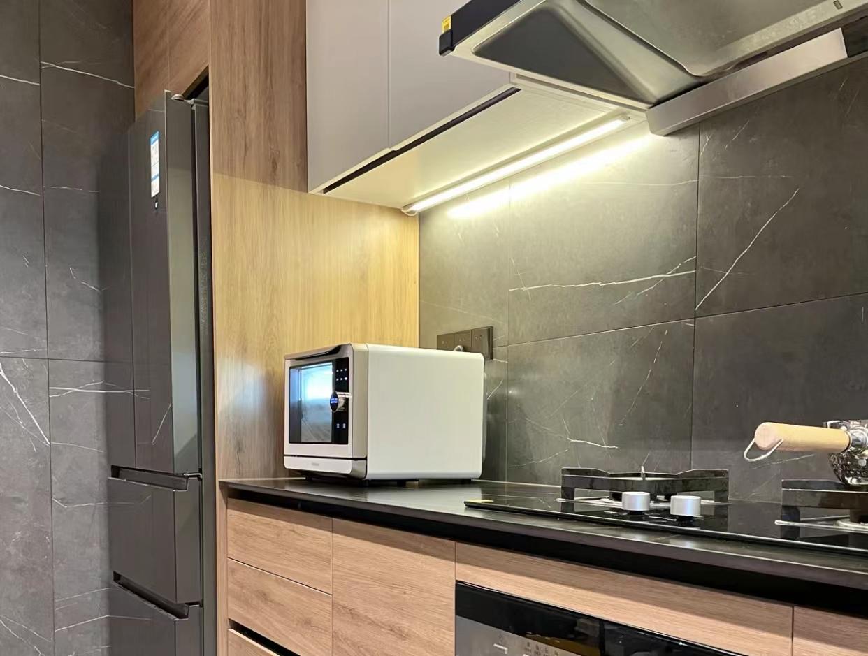 设计成“抽拉式”,做饭的时候拉出来,既好操作又不担心蒸汽问题,不用的时候拉回去,不占用空间。