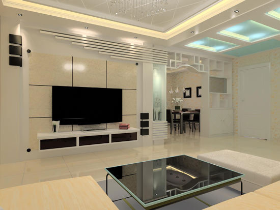 用石膏线做边框造型的电视背景墙,也有很好的装饰效果,让背景墙更有立体感和层次感,尤其常见于美式风格的装修中,是一款物美价廉的装饰材料。