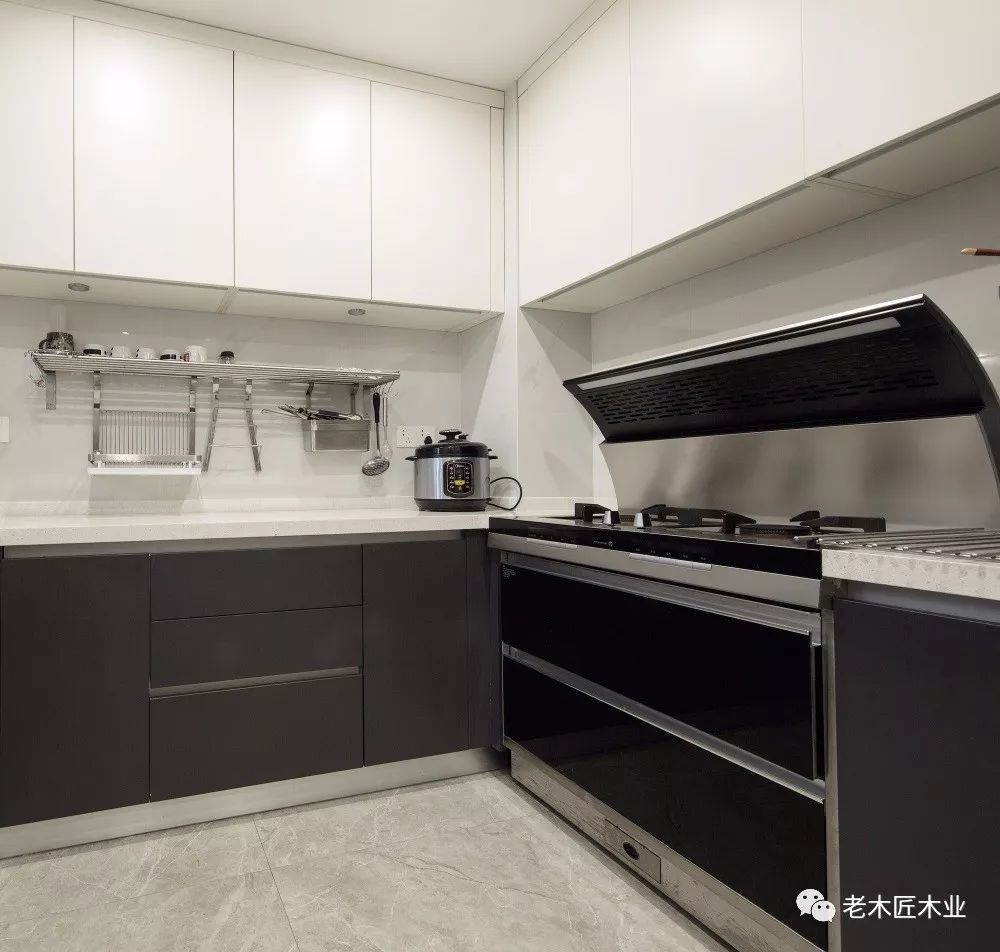 橱柜颜色选用了白色和深灰色两种,搭浅咖色的瓷砖,时尚整洁。
