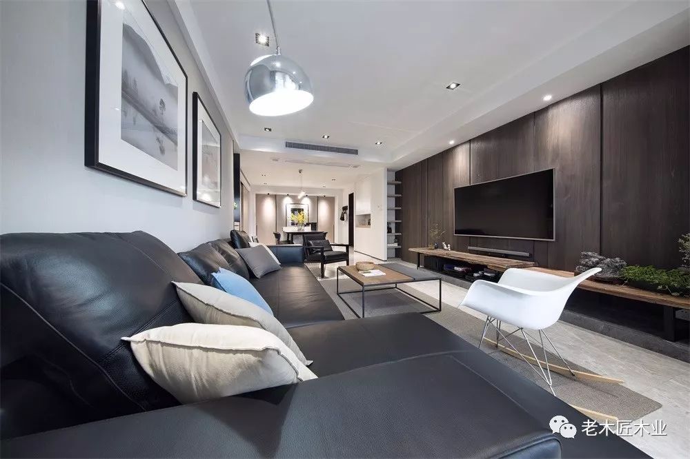 木质电视柜贯穿背景,在良好的采光下,显得更加的温润、舒适,黑色的转角沙发,造型简洁,