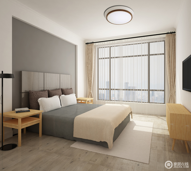 卧室的设计简约而质感,延续了整体的黑白配色实木家具装修效果图,在木质地板与灰色系的床品下,鲜明的色彩对比也得到了平衡,为屋主营造出静谧而质感的睡眠环境。