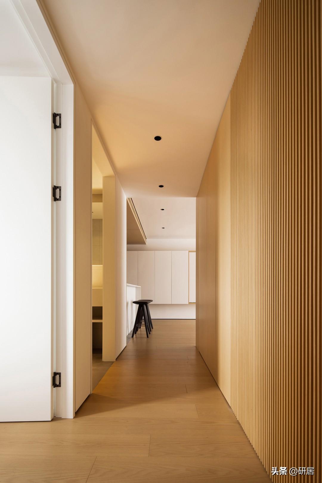 静静的走廊,连着动静两个区域。大量的木质配色,让空间产生一种极具生命力,质感天然,肌理丰富,给人舒适安心的温暖。