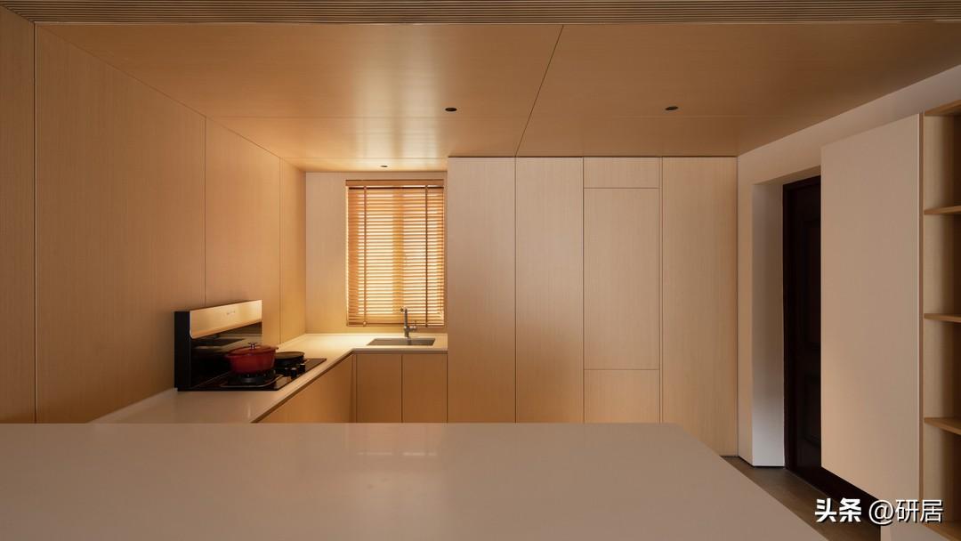 还有一处不同的设计,传统的厨房墙面肯定是贴砖的,但这里打破传统思维,墙面不贴砖而是选择木饰面,它的调性能让空间更具温馨感,小姐姐不太做饭,而且做到每日坚持清洗与维护,她很享受教书后在家洗洗刷刷、整理空间的瞬间,这就是日常生活。而且她选择的大功率集成灶,在一定程度上可以防止油烟“乱窜”。