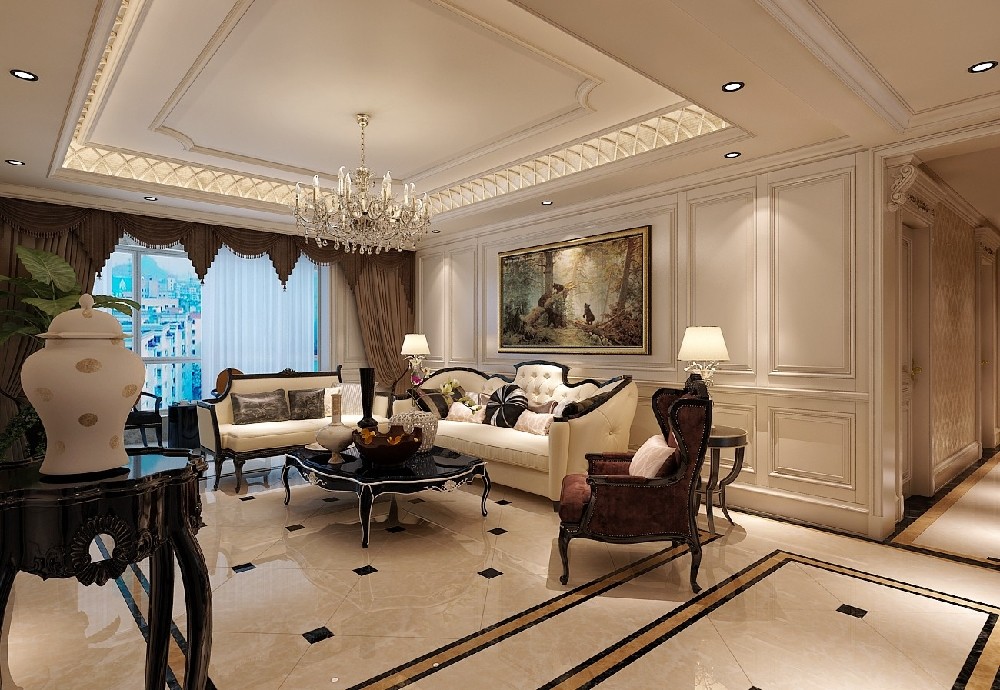 客厅吊顶装修效果图无锡别墅装修实景|鸿墅现代法式欧式豪华客厅设计图片赏析