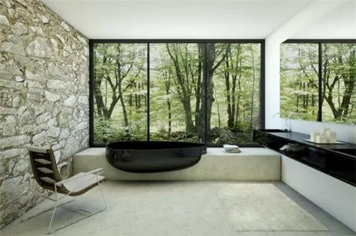 图中这款设计非常有特色,田园式的石头墙面配上大面积的玻璃设计,不但能提升空间的亮度,而且还能起到延伸空间的效果,将窗外的美景引入室内,让丛林的风景和石墙融合在一起,营造出自然、浪漫的气息