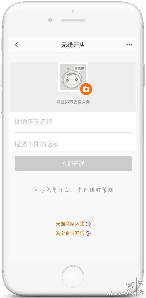 4.点击“无线开店”,进去后取一个店铺名,并且写一句店铺描述。设置完成后,点击“立即开通”。(PS:如果店铺名跟别人雷同就无法保存,可以先随便取一个店铺名,店铺创建以后可以随时更改)