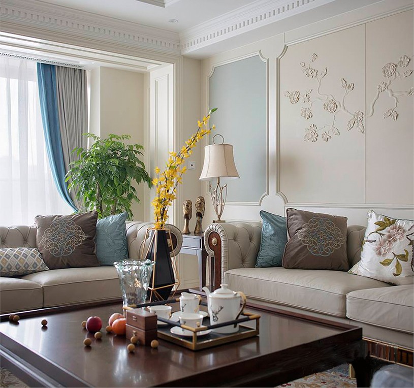 佰富彩客厅窗帘装修效果图【家·设计】薛城公园悦府美式风美式田园客厅设计图片赏析