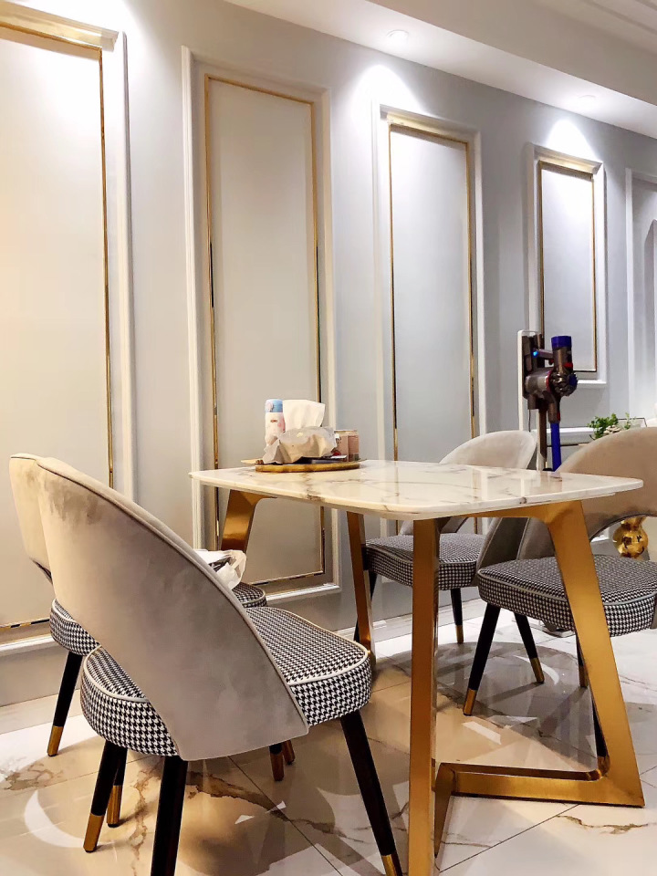 客厅电视背景墙和沙发背景墙除了用了石膏线还用了金属条来装饰很有金属感。