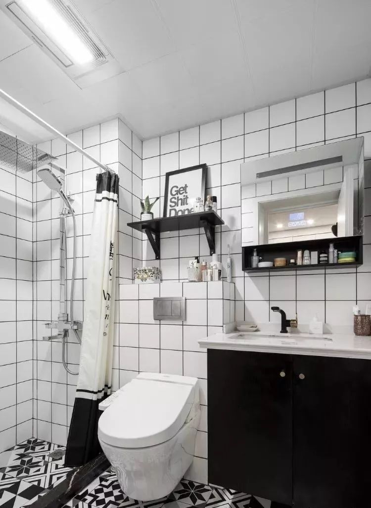 卫生间的面积也不是很宽敞,设计师选择了用浴帘和挡水条来做干湿分离,整体黑白色的搭配让卫生间看起来更有现代感。