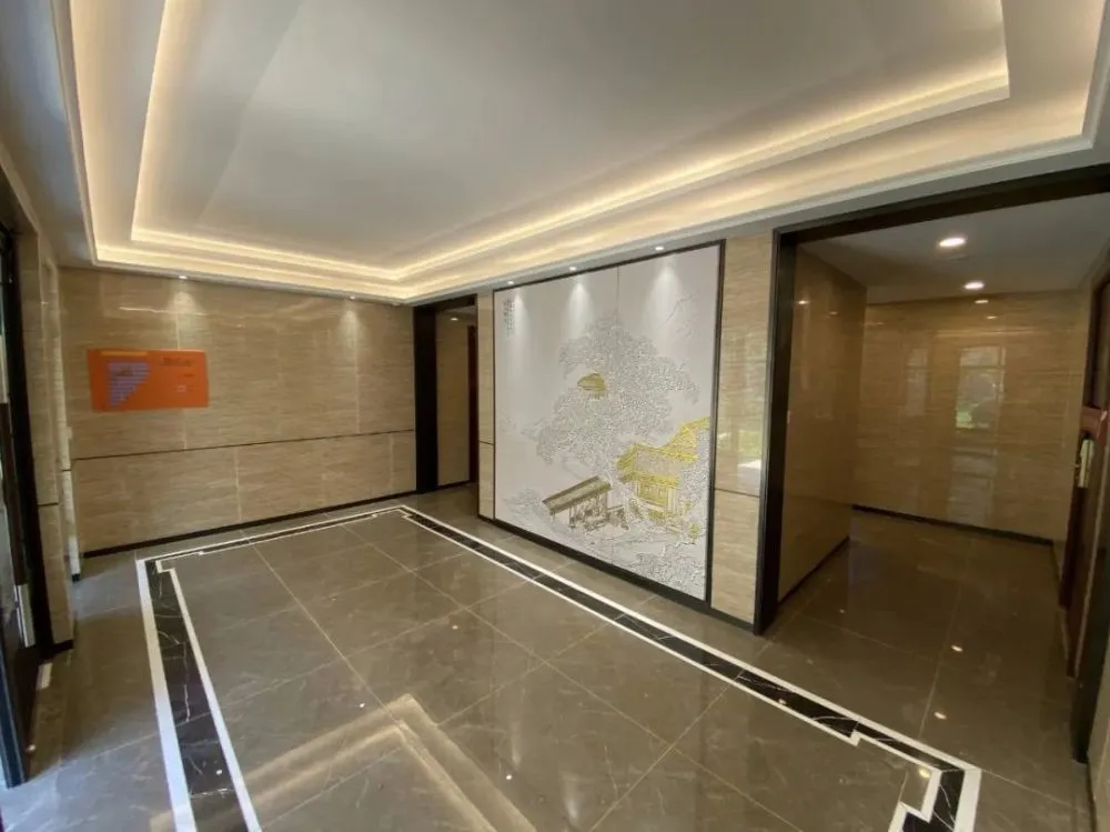 单元入户大门宽敞明亮,贴砖墙面、高级灰的石纹铺地、黑金属踢脚线和装饰线条、环状吊顶,看上去通透大气,也有利于后期维护。