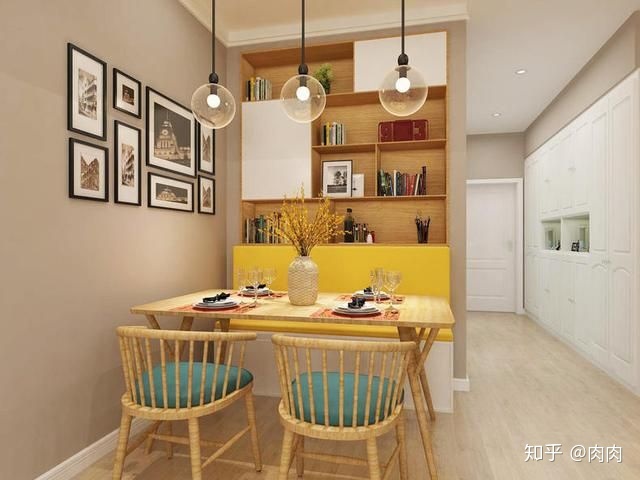 色彩还是很丰富的设计,靠墙打造一体式嵌入式餐边柜,可以用于摆放一些书籍或是美酒,用于餐厅装饰点缀。卡座的设计,搭配原木餐桌椅,圆形玻璃吊灯,谁说北欧风装饰效果就是“冷淡”的,这么暖的装饰值得借鉴。