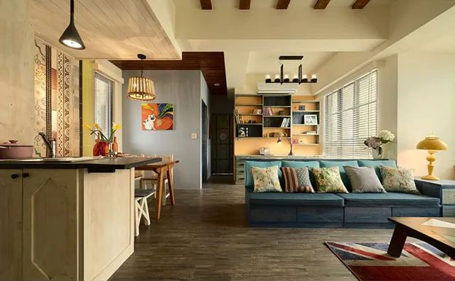 佰富彩案例:深色地板与彩色家居搭配结合,空间区域对比划分明确,使空间充满世外桃源之感,水蓝色的美式沙发拉高客厅清爽度,搭配国旗图样的地毡与碎花抱枕,增添度假风格