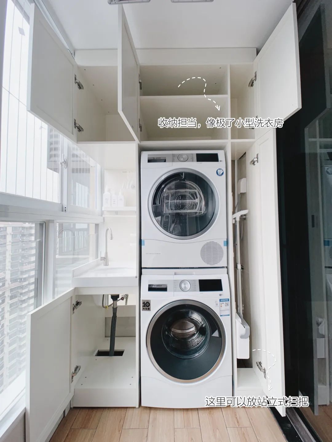佰富彩宽1.8米的阳台简直是豪华配置,同时容纳洗衣机+烘干机+洗手台+储物柜都没问题,甚至还能增加拖把池!