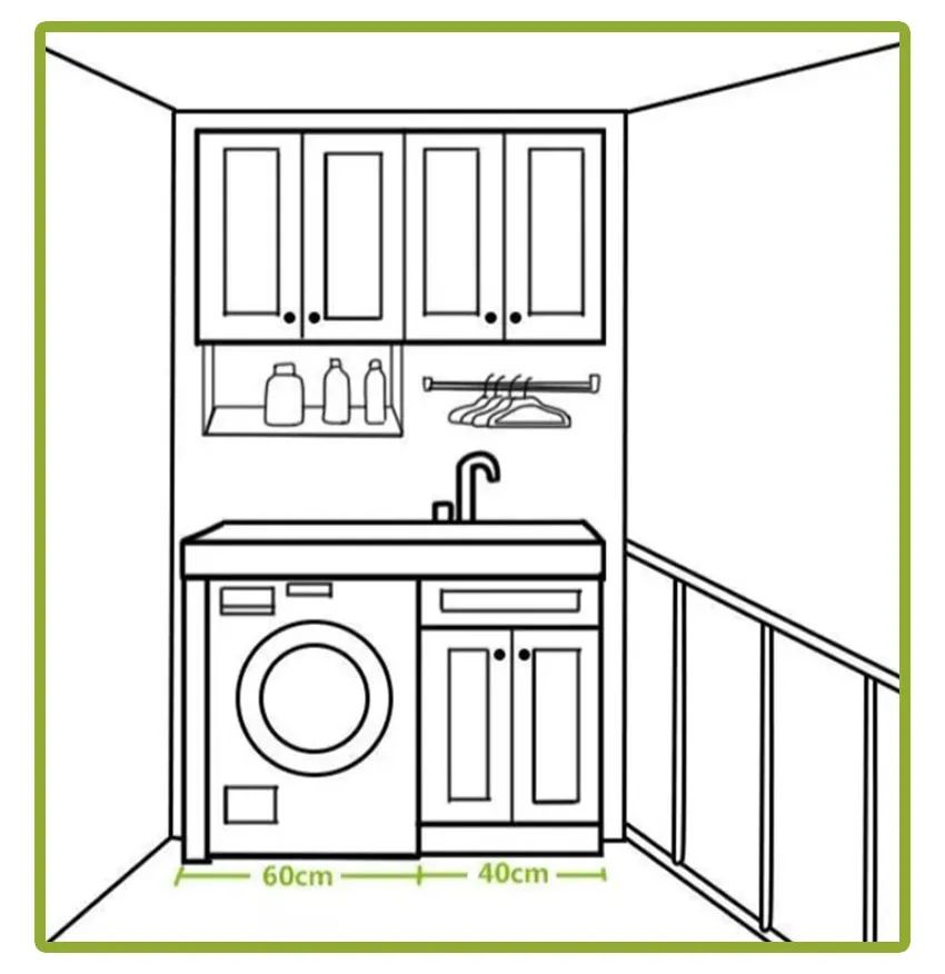 洗衣机的宽度和厚度一般在60cm左右,剩余的40cm空间则可以打造成储物柜,柜子进深与洗衣机一致为60cm,这样的总占地面积仅0.6㎡。