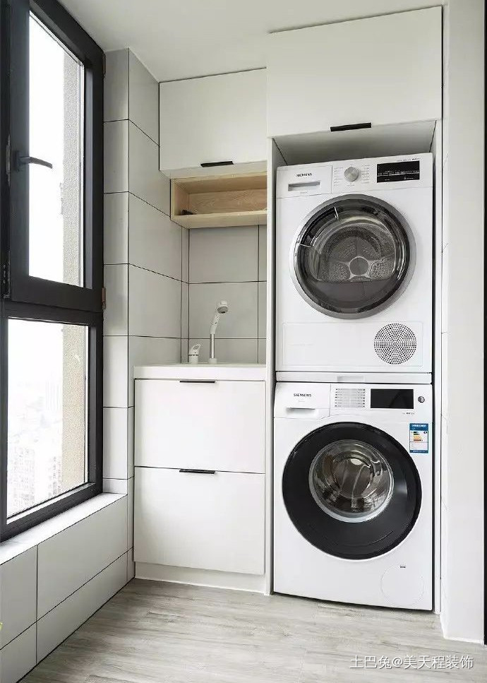 可以根据空间设计需要,将洗衣机和烘干机并排放阳台装修,或者上下叠放。