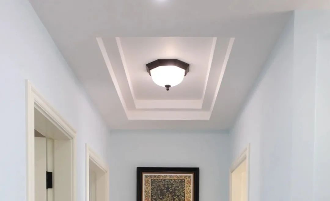 佰富彩▲走廊四周吊顶隐藏横梁,中间留空一个区域,装上吸顶灯,整体空间显得有层次美感。