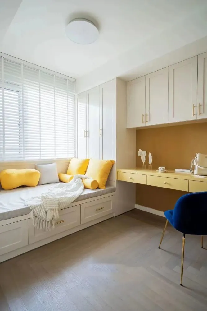 佰富彩2.在床头的位置,做转角书桌+满墙书柜,再也不用担心书籍无处安放,让书香气息扑面而来。