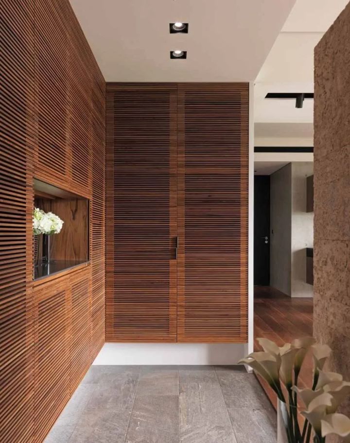 沿着大门旁的墙壁打柜子,创造一个与大门相邻(或平行)的柜体。