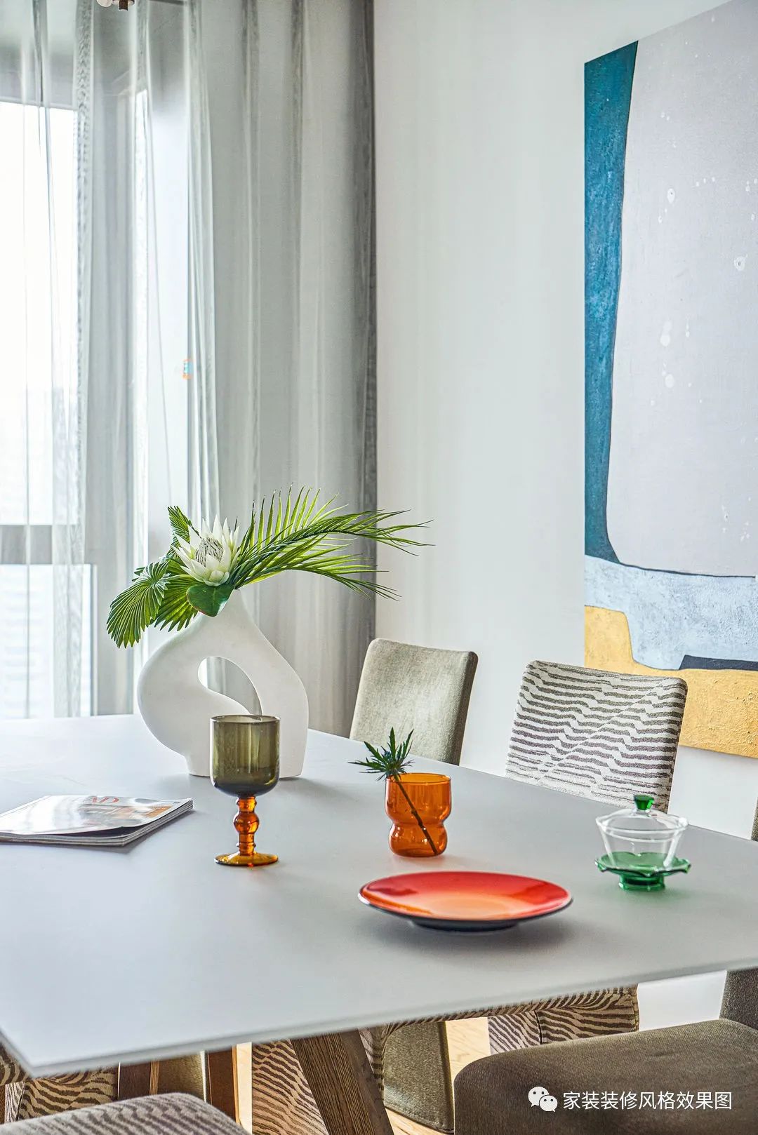 ▲精心选配的餐桌、椅与装饰之间相得益彰;窗纱摇曳间增添了朦胧柔和的意境美与仪式感。人间烟火味,难得是清欢。