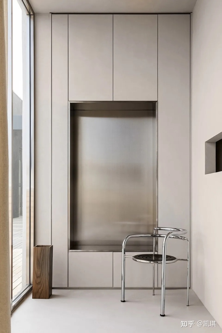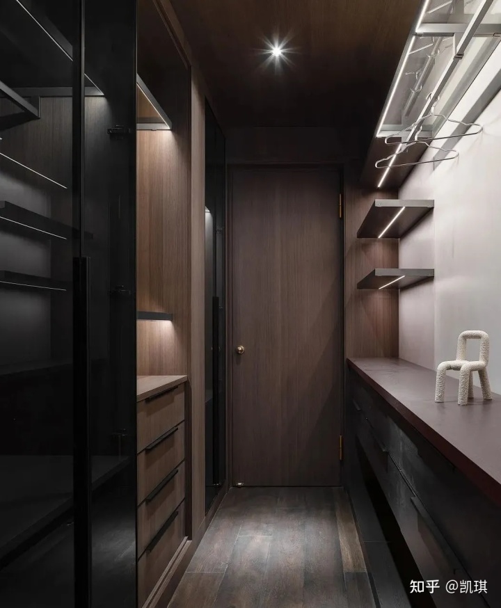 一体式玄关柜:依据空间大小和相应需求进行设定。如果空间够大,可以安装鞋柜+换鞋凳+挂衣区+试衣镜,出门方便,储物能力也足够强大。
