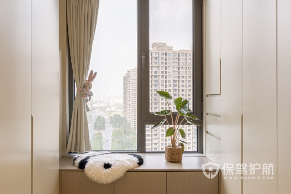 上图是衣帽间装修效果图。当北卧室纳进来后,则是作为独立的衣帽间来使用的。两组一门到顶的大衣柜,临窗增加的飘窗柜不仅带来了无敌的储物能力,也让空间兼具了一定的休闲属性,从而让生活形态更加随性、惬意。