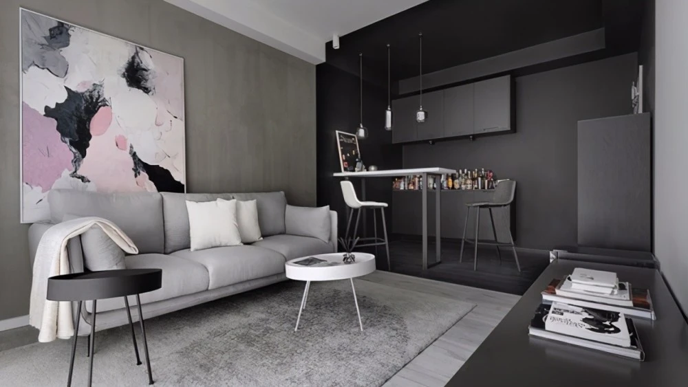2.第二款时尚loft公寓装修效果图的设计中,我们看到这款设计也是时尚感十足,原因是因为它主要是用的黑白灰三色,体现了一种现代的极简式风格。地面选择的是米灰色的瓷砖设计,非常的耐脏。在墙面的位置都是用白色的乳胶漆去打造的。但是在它的沙发正前方的墙面,就是使用浅灰色的瓷砖,非常的简约。楼梯是一个玻璃栅栏的楼梯,用黑色的板材去做了楼梯的梯台的位置。上层有一个小型的卧室,是用纯黑色的木质材料做了包边,非常时尚。
