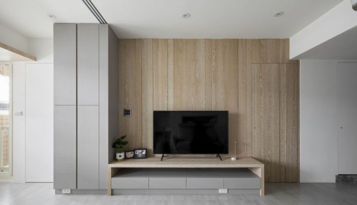 格外注重家庭收纳功能的小伙伴,电视背景墙这个空间可千万别浪费了,直接打上电视柜,增加空间的收纳能力。