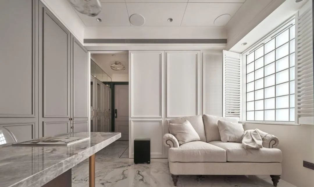 为完善空间风格,不同区域点缀特色灯饰,在小户型不仅有定义使用方式的作用,也能藉此强化新古典风格。