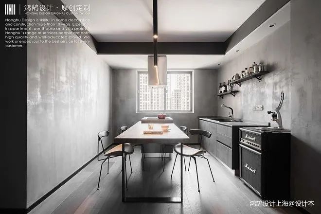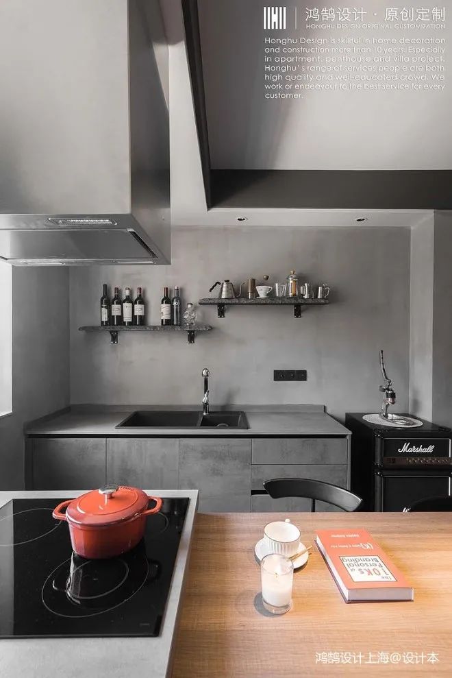 佰富彩厨房水槽柜子用的水泥灰面板要比整体墙面环境深一个色度,铁艺餐椅、Marshall音响仿真冰箱、石头做的层板等复古元素组合搭配,简洁素雅的轻工业风格得到很好体现。