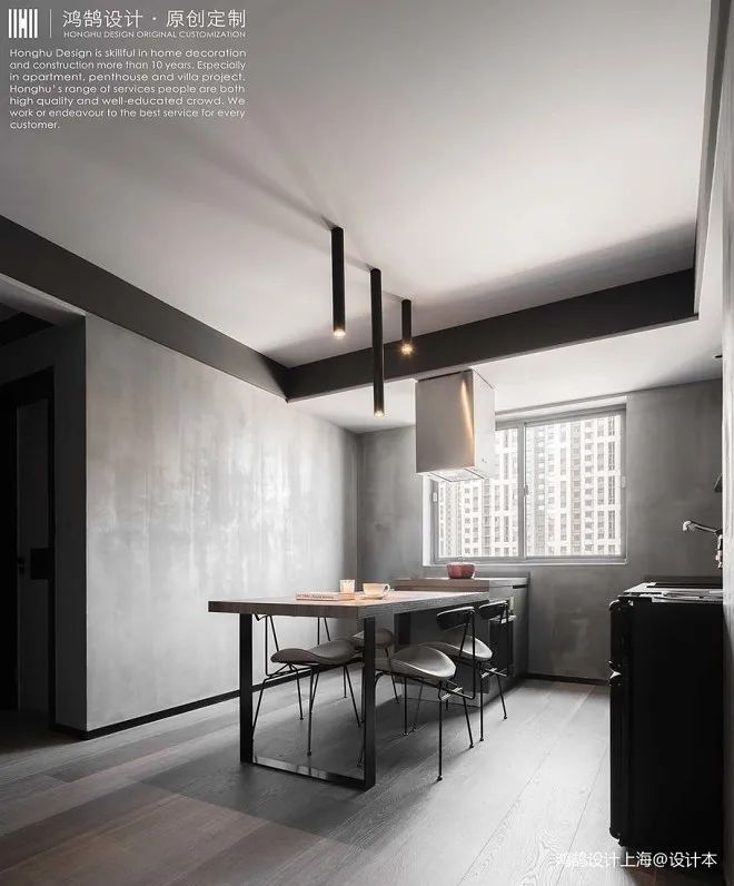 餐厨区一体并做成了开放式设计,把室内空间充分打开,保留了餐厨功能最基础配置,一切从简。由于业主没有中厨需求,因此只保留了西厨功能。